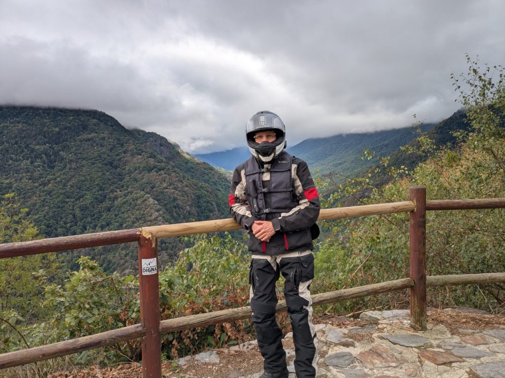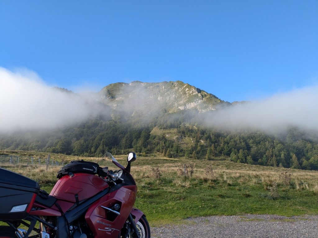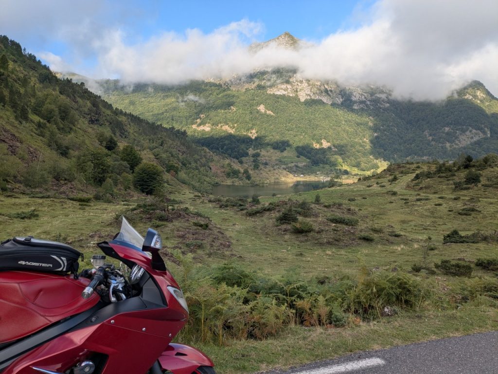 Je reprends la moto 5mn puis me pose pour manger à Aulus. Ensuite côté météo ça se dégrade franchement. Quand on descend dans les vallées on passe sous les nuages et c’est sec, mais dès qu’on remonte on se tape un crachin et une mauvaise visibilité, pas très agréable.
