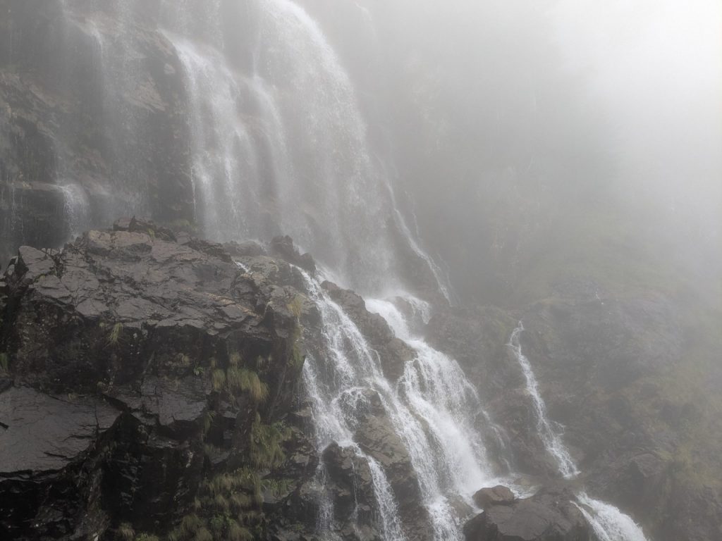 La cascade est assez conséquente, mais hélas perdue dans les nuages, on a du mal à en saisir la totalité. Je profite au maximum du site quand même, et les 2h30 de marche décrassent bien.