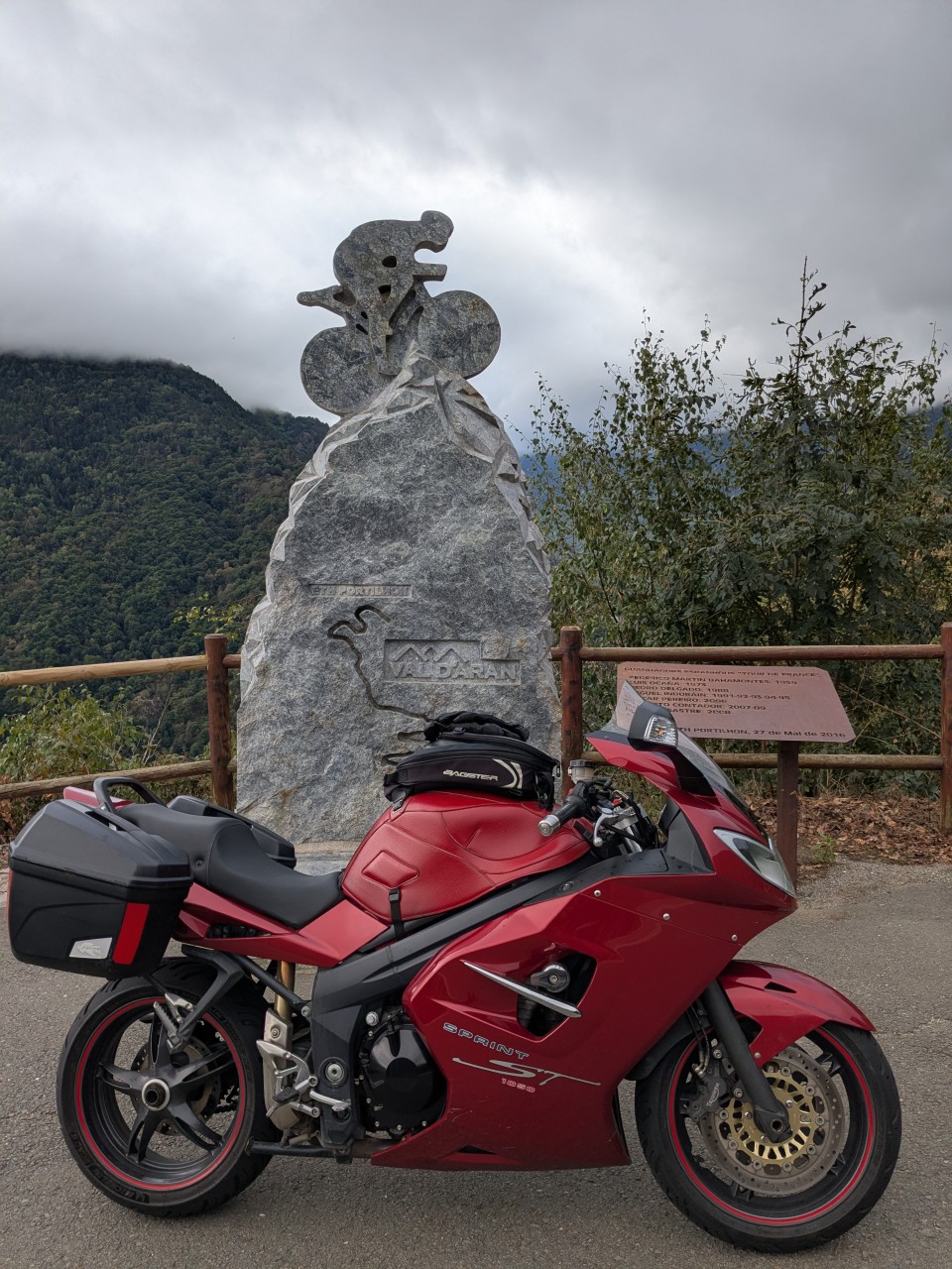 Je reprends la moto 5mn puis me pose pour manger à Aulus. Ensuite côté météo ça se dégrade franchement. Quand on descend dans les vallées on passe sous les nuages et c’est sec, mais dès qu’on remonte on se tape un crachin et une mauvaise visibilité, pas très agréable.