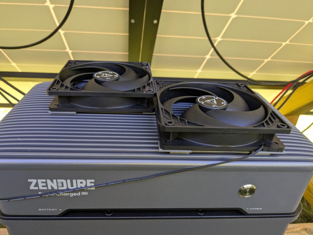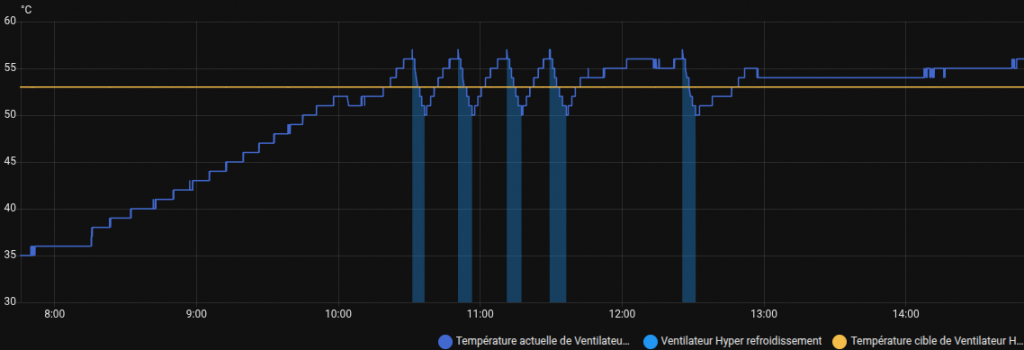 Pour pallier à ce problème j’ai installé deux ventilateurs de PC de 120 mm sur chaque Hyper, reliés à une alimentation 12V sur une prise commandée. Les Hyper fournissant leur température à Home Assistant via l’intégration, un simple thermostat virtuel permet de contrôler tout ça. Je garde mes Hyper en-dessous de 58 degrés et ils m’en remercient en produisant au maximum de leur capacités.