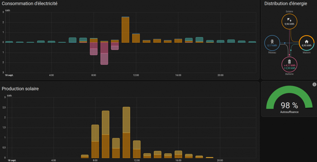 Oui vous avez bien lu. Sur une journée ensoleillée de septembre on a 98% d’autosuffisance électrique.