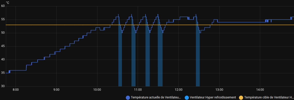 Pour pallier à ce problème j’ai installé deux ventilateurs de PC de 120 mm sur chaque Hyper, reliés à une alimentation 12V sur une prise commandée. Les Hyper fournissant leur température à Home Assistant via l’intégration, un simple thermostat virtuel permet de contrôler tout ça. Je garde mes Hyper en-dessous de 58 degrés et ils m’en remercient en produisant au maximum de leur capacités.